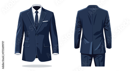 Elegant Navy Blue Business Suit Illustration Displaying Professionalism and Style with Tailored Front and Back Views Revealing a Sophisticated