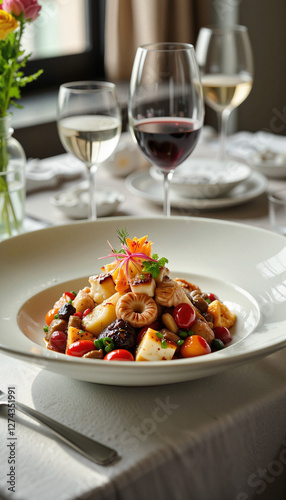 dining, elegance, freshness, epicure, midday, refined, table setting, high-quality, colourful, eatery, presentable, alluring, ingredient, herb, vegetable, plated, glassware, wine, flower, no people, cookery, gastronomy, food photography, natural light, arrangement, inviting, opulent, exquisite, artful, culinary, indulgence, finesse, indoor, 1, favor, upscale, fresh produce