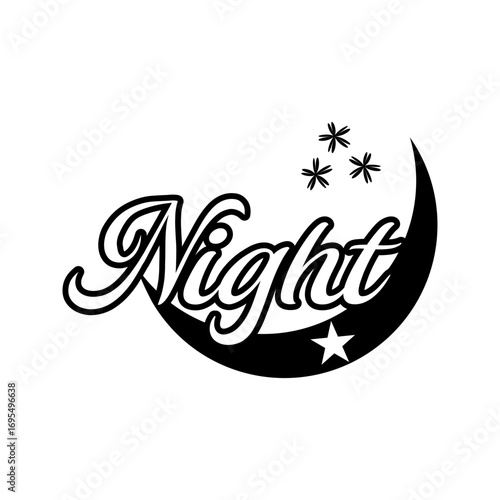 night, moon, star, crescent, dark, sky, evening, black, white, floral, elegant, script, typography, text, design, silhouette, celestial, space, calm, peaceful, dreamy, magic, beauty, nature, decoration, art, graphic, icon, symbol, label, banner, theme, style, classic, simple, modern, smooth, curve, shine, glow, fantasy, mystic, quiet, rest, sleep, starry, gloaming, lunar