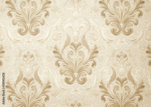 Elegant, ornate damask pattern in beige and taupe. Delicate, flowing floral designs create a rich, classic backdrop. Soft color palette. Perfect for wallpaper, fabric, or digital art