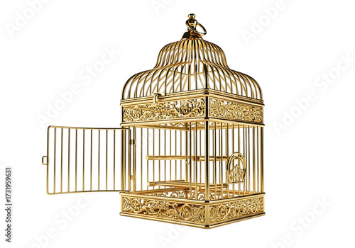 gold, gold, ornate, cage, luxury, open, door, freedom, imprisonment, concept, decorative, detail, vintage, antique, isolated, metal, shiny, beautiful, precious, elegant, design, object, interior, accessory, bird, gaol, empty, white, bird cage, three-dimensional, old, gaol, trapped, home, escape, lock, confined