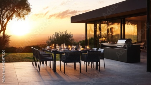 sunset, dining, bar-b-q, chair, table, glasses, candle, landscape, modern, architecture, evening, relaxation, nature, gathering, meal, leisure, home, garden, patio, cooking, food, friends, family, celebration, ambience, warm, light, view, calmness, luxury, design, style, comfort, social, atmosphere, grill, utensil, decor, horizon, tree, serenity, space, enjoyment, life events, aesthetic, elegance, lifestyle, summer