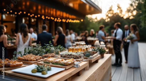 Elegant outdoor reception with appetizers, drinks on wooden tables, and guests mingling in a garden setting with string lights and trees in the background.