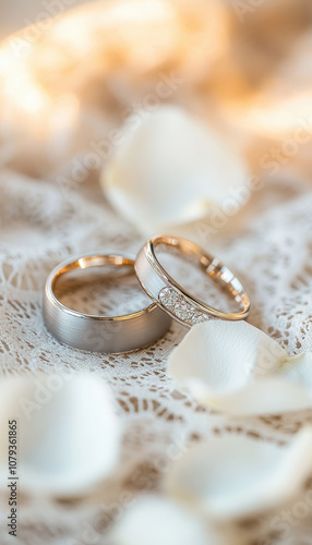Elegant pair of wedding rings on vintage lace with soft white petals, symbolising everlasting love.