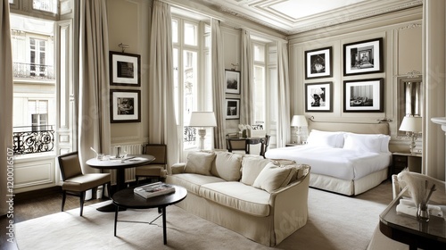 parisian, hotel, suite, interior, design, elegant, sophisticated, luxurious, bedchamber, bed, white, bedding, pillow, couch, sofa, cushion, beige, neutral, table, chair, lamp, light, window, curtain, drape, floor, rug, carpet, artwork, picture, frame, black, photo, classic, style, french, ornate, molding, fireplace, mantel, decor, room, apartment, living, space, comfort, home, stylish