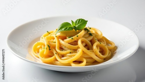 Elegant pasta dish, minimalist white backdrop , tomato, minimalist