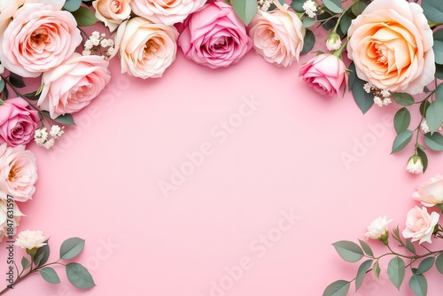 Elegant pastel pink and cream roses forming a decorative frame on a soft pink background for a romantic celebration concept and feminine design with copy space