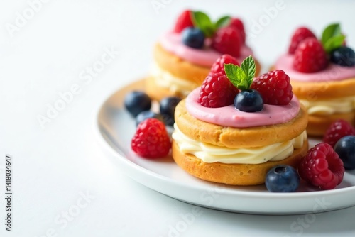 Elegant pastries, berries, sprig of mint, white backdrop , foodstyling, foodie, minimal