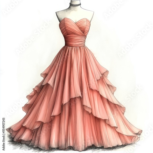 Elegant peach-colored tiered gown fashion sketch.