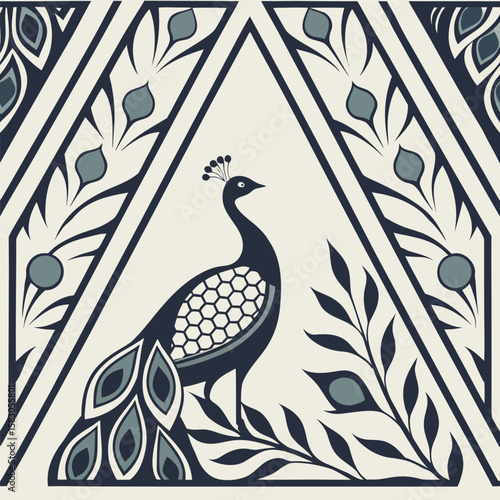 Elegant peacock illustration in an art deco style with geometric floral frame decoration