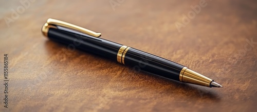 Elegant pen resting on a wooden table symbolizing financial planning and business strategy with space for additional text or branding