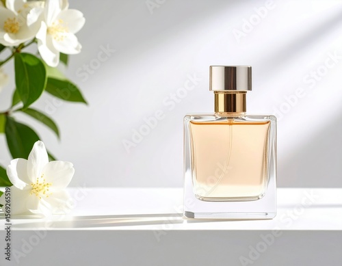 perfume, bottle, elegant, glasses, fragrance, beauty, product, cosmetic, floral, white, background, shadow, light, luxury, design, modern, stylish, aesthetic, presentation, realistic, minimal, clean, sophisticated, composition, studio, isolated, photo, advertising, promotion, scent, arrangement, jasmine, flower, leaf, green, nature, organic, fresh, spring, summer, daylight, bright, clear, reflective, transparent, gold, square, shape
