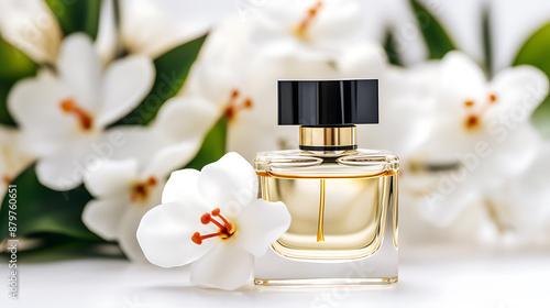 Elegant perfume bottle with white flowers, purity, freshness, floral scent