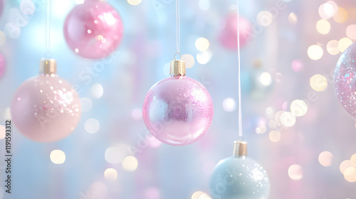 Elegant Pink and Blue Christmas Baubles with Glittering Ribbons on a Soft Background