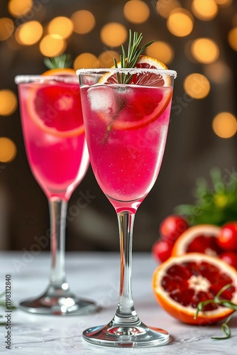 Elegant pink cocktails accented with orange slices and herbs, served in delicate glasses, presenting a refined and festive atmosphere perfect for celebrations.