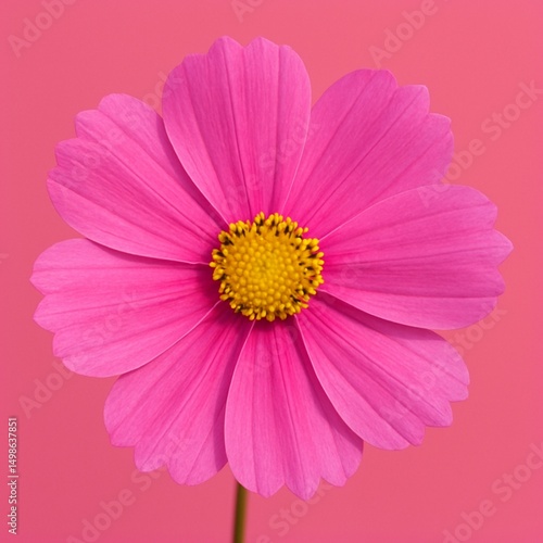 Elegant Pink Cosmos Flower Close-Up Featuring Symmetrical Petals and Central Disc Floret on Pink Background