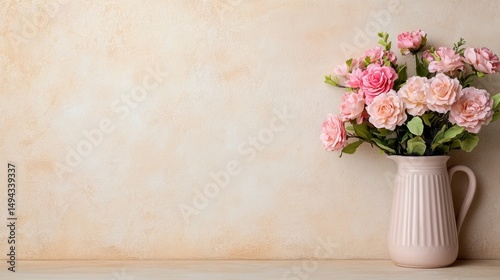 Elegant pink rose arrangement in a soft beige environment floral still life indoor decor peaceful atmosphere