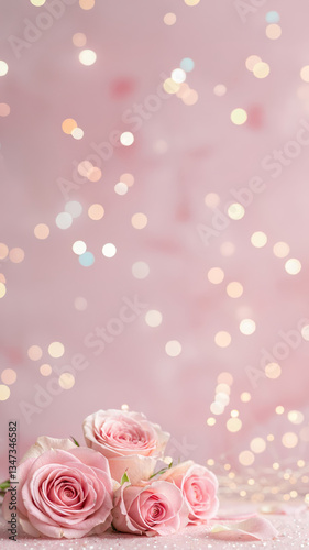 Elegant Pink Roses Arranged On A Glittering Surface Against A Soft Bokeh Background. Ideal For Valentine's Day, Weddings, Romantic Celebrations, Mother's Day, And Luxury Floral Decor...