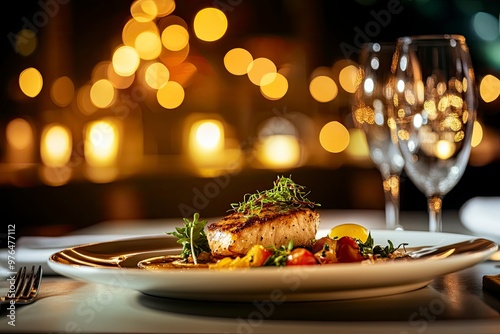 Elegant plated dish in a sophisticated restaurant setting with warm bokeh lighting in the background, highlighting the ambiance and fine dining experience , ai