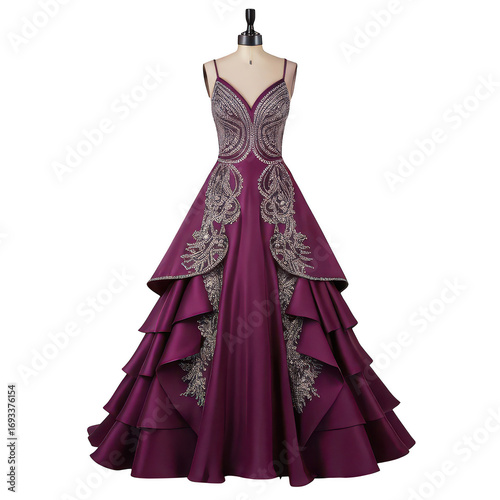 Elegant plum colored ball gown with intricate embroidery isolated on transparent background
