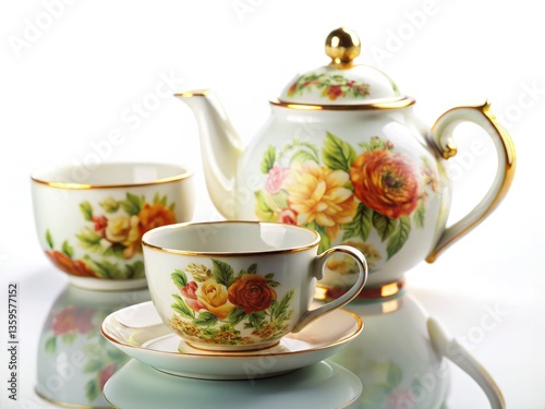 Elegant porcelain teapot and cups gleam against a stark white backdrop in this high-resolution stock image.