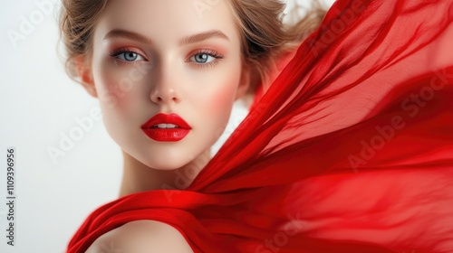 make-up, skincare, beauty, elegant, portrait, woman, red, fabric, fashion, glamour, model, lipstick, eye, feminine, wind, vibrant, style, chic, sophistication, allure, photo, modern, trendy, look, posing, closeup, stylish, sleek, aesthetic, cosmetic, flawless, expression, soft, background, lighting, blond, coiffure, lip, perfection, confident, face, gaze, graceful, artistic, visual, bright, enchanting