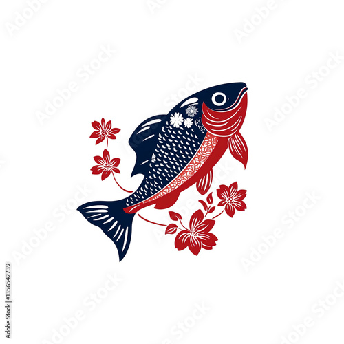 carp, cherry blossom, floral, flower, japanese, asian, red, blue, dark, illustration, graphic, design element, pattern, art, nature, aquatic, fish, animal, elegant, sophisticated, beautiful, vibrant, symbol, culture, tradition, spring, water, underwater, decorative, vintage, retro, tattoo, textile, fabric, wallpaper, background, poster, card, invitation, template, artwork, stylised, minimalist, graphic design