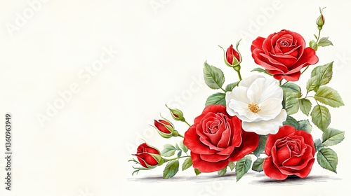 rose, flower, red rose, white rose, floral arrangement, romantic, elegant, wedding, invitation, greeting card, design element, floral pattern, nature, beauty, detailed, realistic, vintage, classic, bud, leaf, green leaf, painting, illustration, artistic, decorative, image, background, texture, wallpaper, still life, botanical, plant, rose petal, blossom, flower, floral, spring, summer
