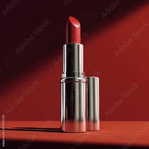 Elegant red lipstick in a sleek silver tube resting on a backdrop of warm red tones in a stylish setting