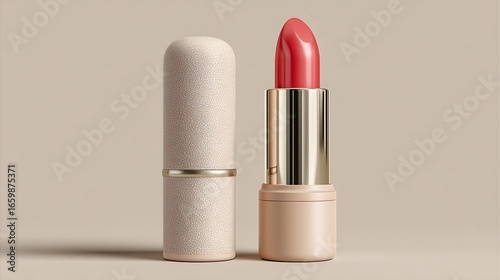 Elegant Red Lipstick Product Shot with Textured Packaging and Gold Accents on a Neutral Background for Beauty Advertising
