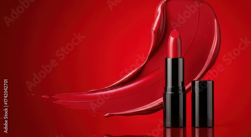 Elegant red lipstick with smear on matching background for beauty concept