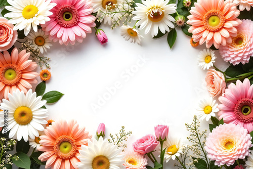 flower, floral, background, border, bouquet, flower petals, nature, garden, fresh, frame, spring, blossom, bloom, rose, daisy, gerbera, foliage, decorative, botanical, greeting, wedding, celebration, invitation, feminine, pastel, romantic, vibrant, colourful, season, leaf, layout, symmetry, design, template, pink, white, orange, creative, elegant, soft, greenery, rose, styling