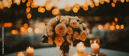 Elegant rose bouquet with candles and bokeh lights for special occasions