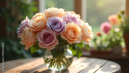 rose bouquet, rose, rose, floral arrangement, floral arrangement, bouquet, blossom, bloom, blooming, flora, botanical, vase, table, wooden table, arrangement, centrepiece, romantic, soft, pastel, peach, lilac, tender, beautiful, elegant, indoor, window, daylight, still life, closeup, delicate, pretty, fresh, decorative, gift, celebration, event, decoration, interior, home decor, plant, natural, nature, garden, leaf, stem
