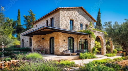 Elegant rural home with natural stone, large glass doors, covered patio, landscaped garden, vibrant shrubs,
