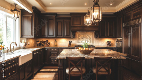 Elegant Rustic Kitchen Design: A Harmony of Dark Wood, Granite Countertops, and Warm Lighting for a Cozy Culinary Experience