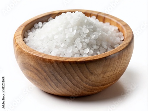 Elegant sea salt, nestled in a wooden bowl, on a white backdrop. Food photography.