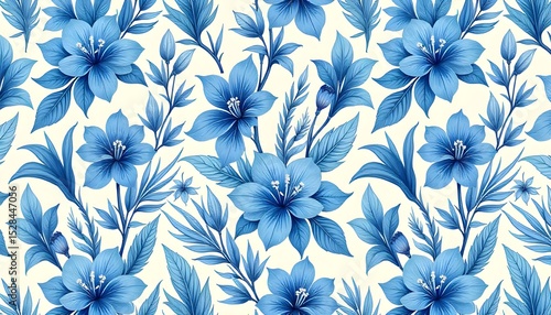 Elegant Seamless Blue Floral Pattern with Vintage Botanical Motifs on Cream Background for Wallpapers, Textiles, and Luxury Packaging