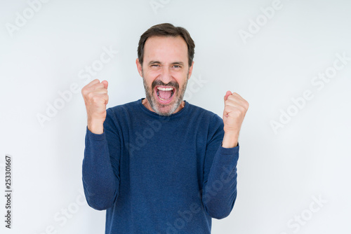 Elegant senior man over isolated background celebrating surprised and amazed for success with arms raised and open eyes. Winner concept.