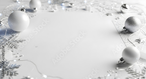 Elegant silver Christmas ornaments and twinkling lights on a white festive background, holiday season.
