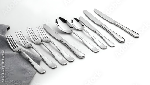 Elegant stainless steel cutlery set, arranged on white surface with a grey cloth