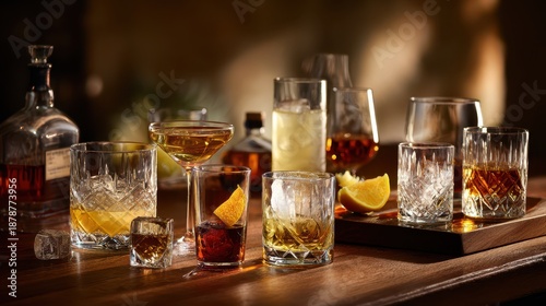 Elegant still life of clear and amber liquors in mixed glasses