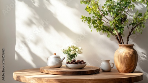 table, teapot, flower, vase, wooden, decor, natural, sunlight, shadow, arrangement, nature, still life, home, interior, relaxation, design, minimalist, freshness, beauty, organic, ceramic, greenery, simplicity, peaceful, aesthetic, artistic, cosy, elegance, warmth, home decor, seasonal, calmness, soft light, handcraft, modern, serene, lifestyle, inspiration, earth-tone, inviting, calming, fresh, style, indoor, natural light