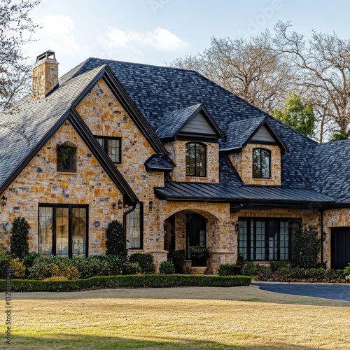 Elegant Stone Residence with Dark Trim and Manicured Lawn Under a Sunny Sky
