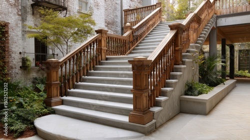 Elegant stone staircase with wooden railings