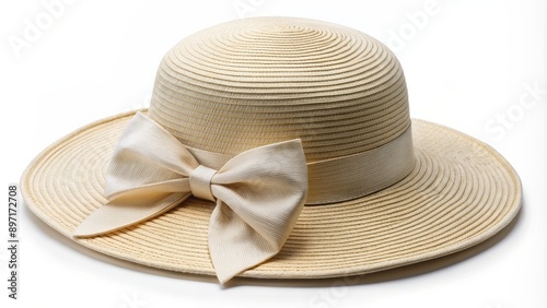 Elegant straw hat adorned with delicate ribbon and charming bow, perfectly centered on a crisp white background, evoking summer serenity.