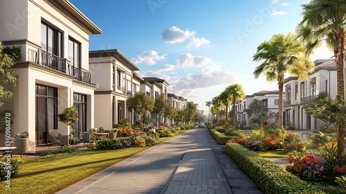 residential, neighbourhood, architecture, modern, luxury, street, house, development, exterior, real estate, suburb, home, property, building, design, landscape, palm, tree, sky, cloud, sunny, day, sidewalk, lawn, garden, flower, plant, facades, contemporary, lifestyle, outdoors, community, driveway, road, estate, investment, residence, construction, urban, scenery, perspective, peaceful
