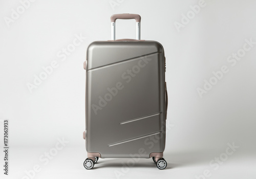 baggage, suitcase, travel, vacation, journey, trip, holiday, aerodrome, baggage, bag, wheel, handle, modern, stylish, elegant, chic, sophisticated, metallic, grey, silver, taupe, smooth, clean, minimalist, simple, studio shot, isolated, background, white, object, transportation, accessory, packing, departure, arrival, front view, upright, standing