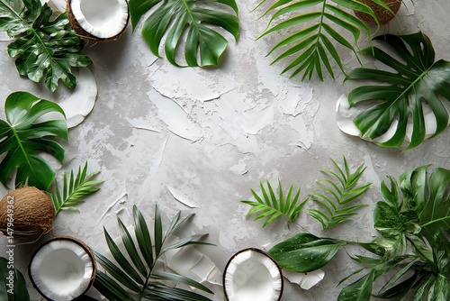 Elegant summer flat lay featuring fresh leaves and coconut shells arranged on a textured surface