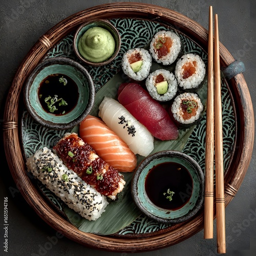 Elegant sushi platter with bamboo design high resolution picture